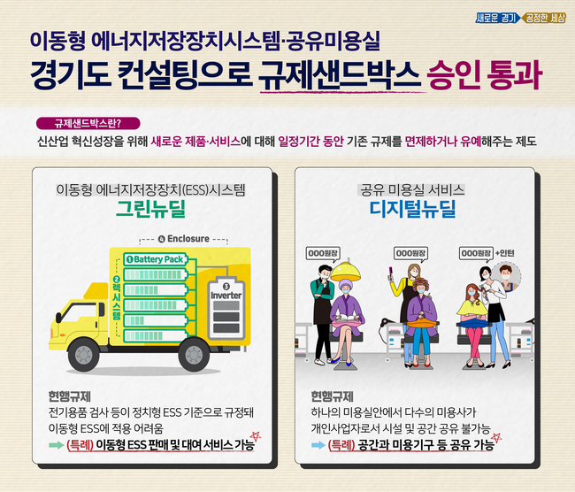트럭 및 배터리팩을 이용한 ‘이동형 에너지 저장장치(ESS) 시스템’, 1개의 미용실 내에서 다수의 미용사가 미용 시설을 공유하는 ‘공유미용실 서비스’가 현행 규제의 문턱을 넘게 됐다. 두 사업은 각각 그린뉴딜과 디지털뉴딜에 속하는 신산업이다.