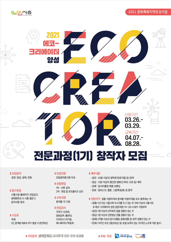 시흥시가 문화특화지역조성사업의 일환으로 ‘2021 에코-크리에이터(Eco-Creator) 양성 전문과정(1기)’ 창작자를 모집한다.