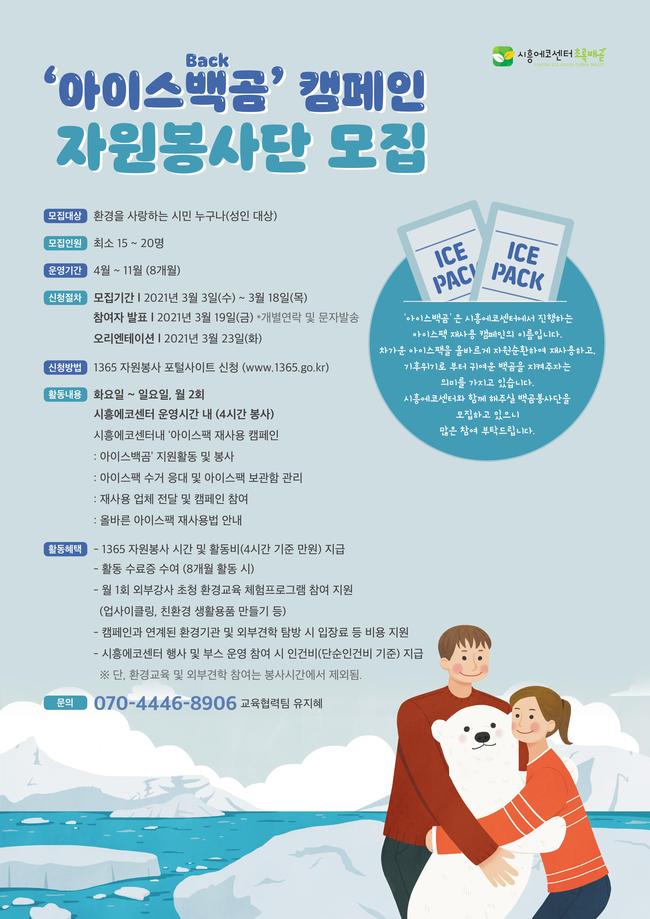 시흥에코센터 초록배곧은 ‘아이스백(Back)곰’ 캠페인에 참여할 자원봉사자를 모집한다. ‘아이스백(Back)곰’은 아이스팩의 재사용 활성화를 촉진해 올바른 자원순환의 인식을 만들어 가기 위한 시흥에코센터의 새로운 캠페인이다.