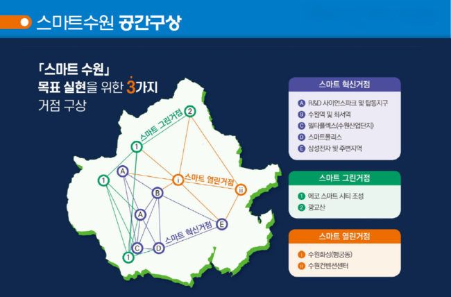또 에코 스마트 시티를 조성하고 광교산 등 자연을 활용하는 스마트 그린거점, 수원화성과 수원컨벤션센터 등 관광객의 유입이 많은 지역을 스마트 열린거점으로 삼아 스마트도시계획을 추진할 예정이다.