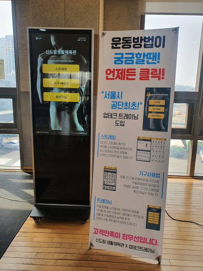 무인 트레이닝 시스템인 ‘업테크트레이닝’은 대형 모니터를 통해 스트레칭, 부위별 기구 사용법, 성별과 단계를 고려한 운동 방법 등 다양한 프로그램을 제공한다.