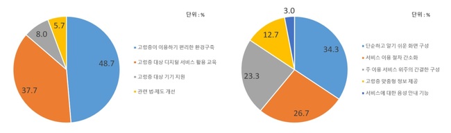 설문조사는 서울 거주 65세~79세 300명을 대상으로 이뤄졌다. 응답자의 디지털 기기·서비스 개선방안으로는 ‘단순하고 알기 쉬운 화면구성' 34.3%, ‘서비스 이용절차 간소화' 26.7%, ‘주 이용 서비스 위주의 간결한 구성' 23.3% 순으로 응답했다.