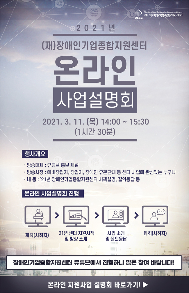 사업주관기관인 장애인기업종합지원센터는 장애인들이 사업을 잘 이해 할 수 있도록 이날 오후 2시 유튜브 채널을 통해 온라인사업설명회를 개최한다.