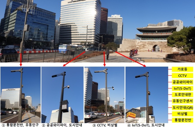 또한 청계천변 청계1가 도로 일대에는 가로등과 CCTV, S-DoT, 유동인구 측정센서 등이 결합된 가로등 스마트폴을 설치해 도시현상 확인 및 시민안전 서비스를 제공한다.