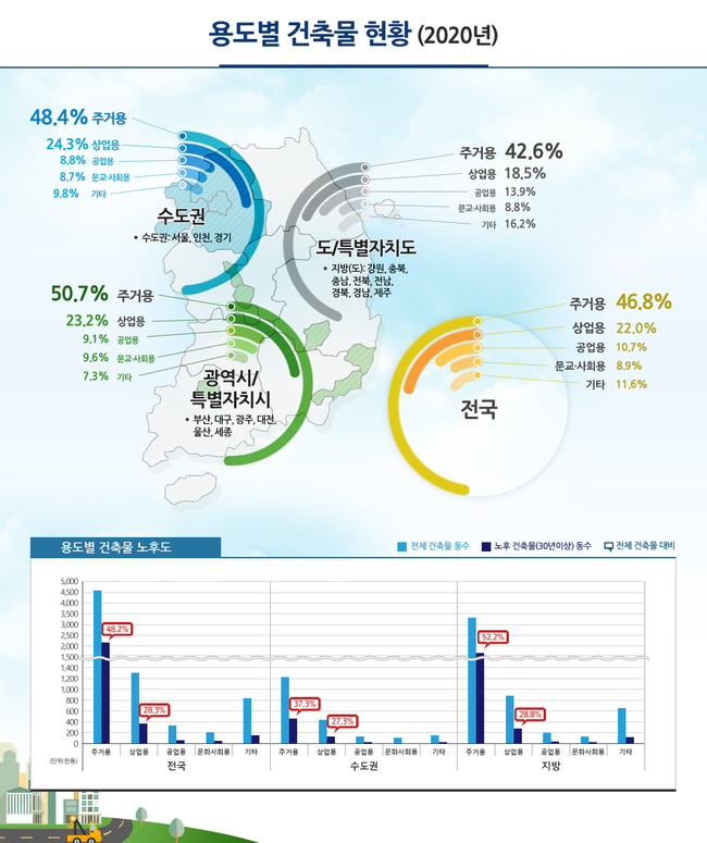 2020년 기준 용도별 건축물 현황 (자료=국토교통부)시도별 건축물 면적 비율 현황을 살펴보면 ▲단독주택은 전남 45.4%, 제주 35.7%, 경북 34.9%가 ▲다가구주택은 대전 16.0%, 대구 14.2%, 제주 12.1% 순으로 높으며, ▲아파트는 세종 84.0%, 광주 75.1%, 부산 72.3%, ▲연립주택은 제주 11.7%, 서울 3.4%, 강원 2.6%, ▲다세대주택은 서울 14.9%, 인천 12.6%, 제주 10.5%가 높았다.