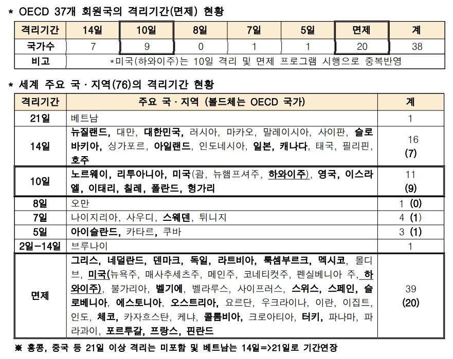 OECD 37국 중 20국(지역) 및 주요 76국(지역) 중 39국(지역)이 격리면제를 시행하며, 격리기간 단축과 방역관리를 동시에 확보하는 방향으로 진행하고 있다.