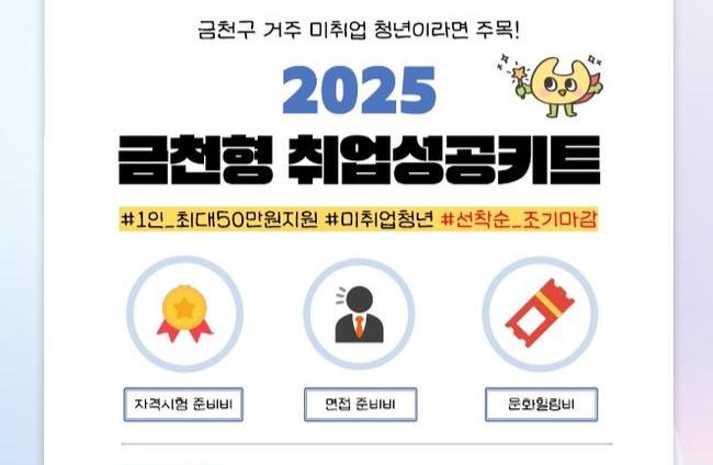 금천구(구청장 유성훈)는 미취업·미창업 청년의 구직활동을 지원하기 위해 '2025 금천형 취업성공키트' 신청자를 오는 11월 30일까지 모집한다고 밝혔다.
