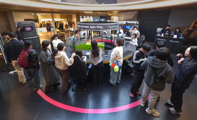 관람객들이 삼성 오디세이 게이밍 모니터와 갤럭시 스마트폰으로 게임 플레이를 경험할 수 있는 ‘오디세이 게임 스테이션’ 팝업 체험존을 방문하고 있다