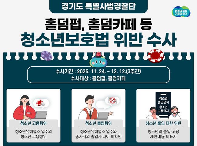 경기도 특별사법경찰단이 오는 24일부터 12월 12일까지 도내 홀덤펍·홀덤카페를 대상으로 청소년의 출입·고용 등 불법행위를 집중 수사하며, 수능 이후 증가할 수 있는 사행행위 노출을 사전에 차단하기로 했다.