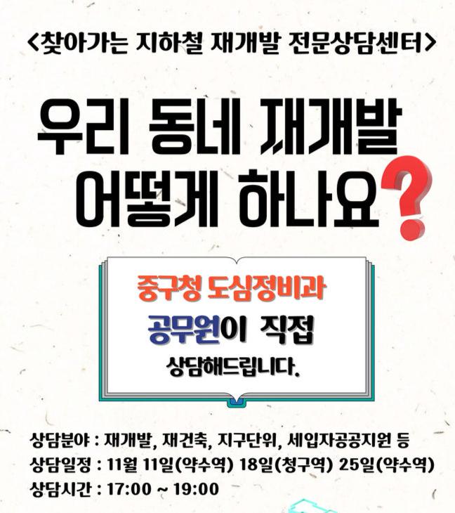 중구 찾아가는 지하철 재개발 전문상담센터 홍보 포스터.서울 중구(구청장 김길성)는 재개발 정보 제공을 위해 ‘찾아가는 지하철역 재개발 전문상담코너’를 운영하며 주민들의 큰 호응을 얻고 있다고 19일 밝혔다.