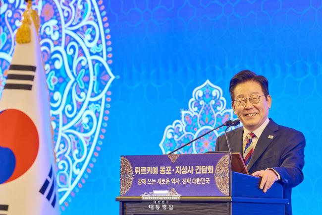 튀르키예를 국빈 방문 중인 이재명 대통령이 25일(현지시간) 앙카라의 한 호텔에서 열린 동포·지상사 간담회에서 발언하고 있다.