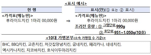 식약처는 12월 15일부터 치킨을 판매하는 10대 프랜차이즈 가맹점 약 1만2,560곳을 대상으로 ‘조리 전 총 중량’ 표시를 의무화한다.