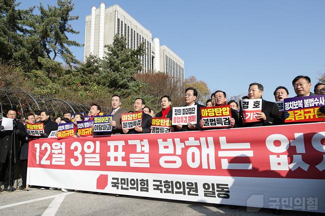 2일 오후 장동혁 당 대표와 송언석 원내대표는 당 국회의원들과 함께 서울 서초구에 위치한 서울중앙지법 앞에서 추경호 의원 구속 심사에 대하여 규탄대회를 열었다.