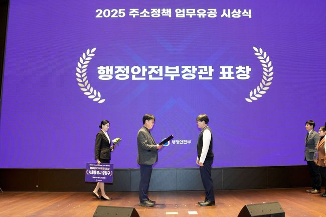 중랑구, ‘2025년 주소 정책 업무 유공’ 평가 서울시 유일 우수기관 선정.24일 중랑구(구청장 류경기)는 행정안전부가 주관한 ‘2025년 주소 정책 업무 유공’ 평가에서 서울시 자치구 가운데 유일하게 우수기관으로 선정돼 행정안전부 장관 표창을 수상하고, 특별교부세 4,000만 원을 확보했다고 밝혔다.