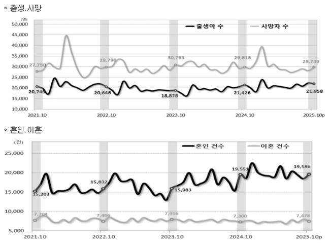 통계청 ‘2025년 10월 인구동향’에 따르면 10월 출생아 수는 2만1958명으로 1년 전보다 2.5% 늘었지만 사망자 수가 2만9739명에 달해 자연증가(출생-사망)는 -7781명으로 자연감소가 이어졌다.
