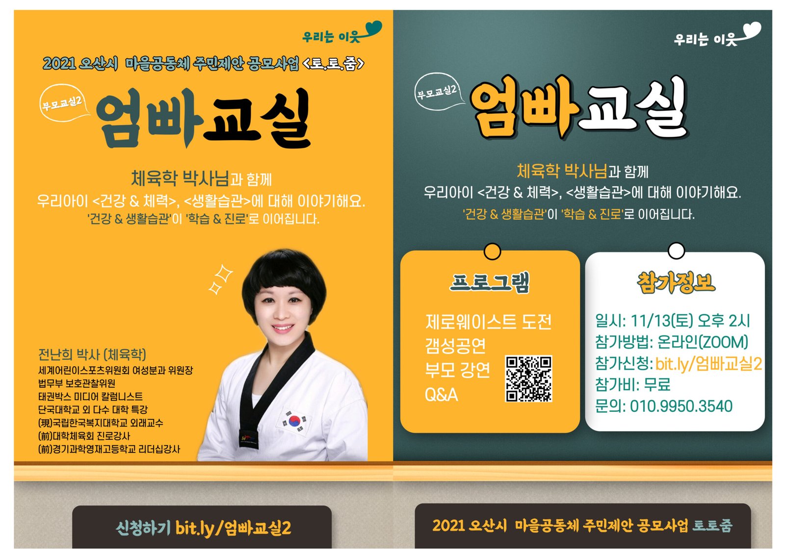 ‘우리는 이웃’은 11월 13일 오후 2시 ‘2021 오산시 마을 공동체 주민제안 공모사업’의 일환으로 「비대면 부모교육2 엄빠교실」을 개최한다.