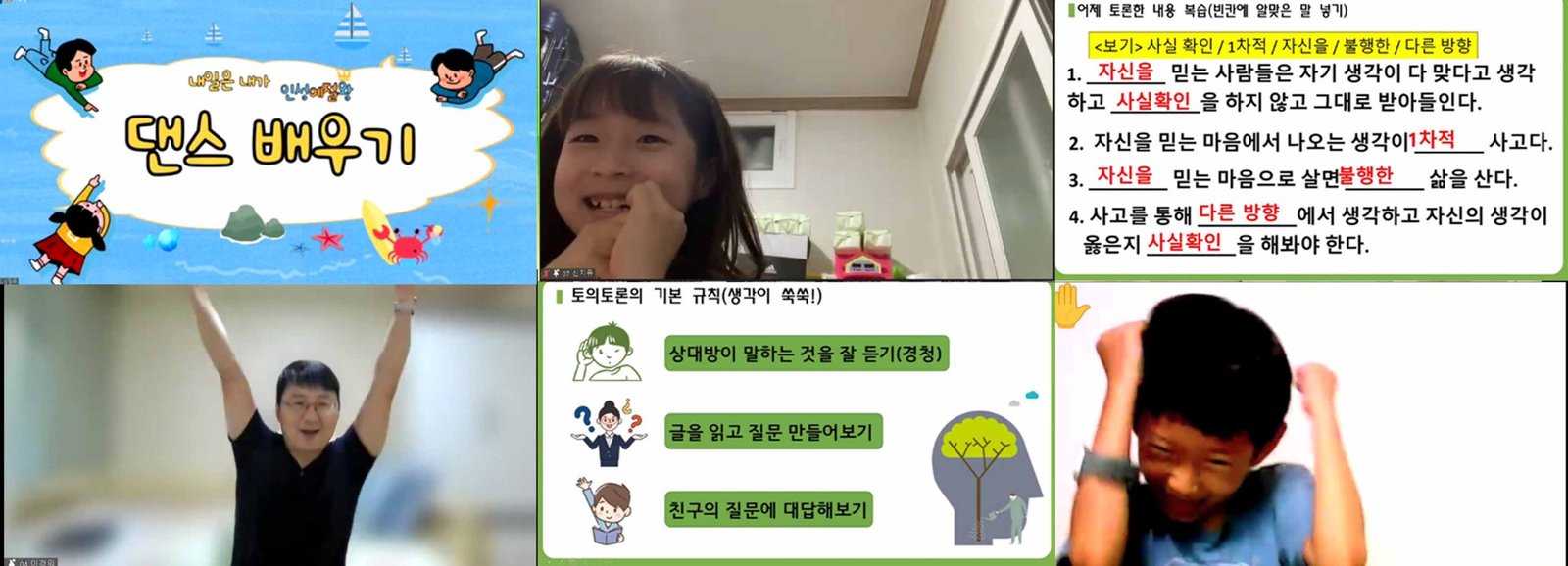 첫날, 반별 토의토론 시간 어린이들은 “반 아이들과 토론이 재미있고 사고력이 커진 것 같아요” “인성드라마가 인상 깊었어요” “2차적 사고를 해야 하는 중요성을 알게 됐어요”라고 말했고 학생들은 사고력을 키우는 방법으로 자연 관찰, 독서하기, 1차적으로 올라오는 생각을 깊이 생각하는 연습이 도움이 된다고 발표했다.