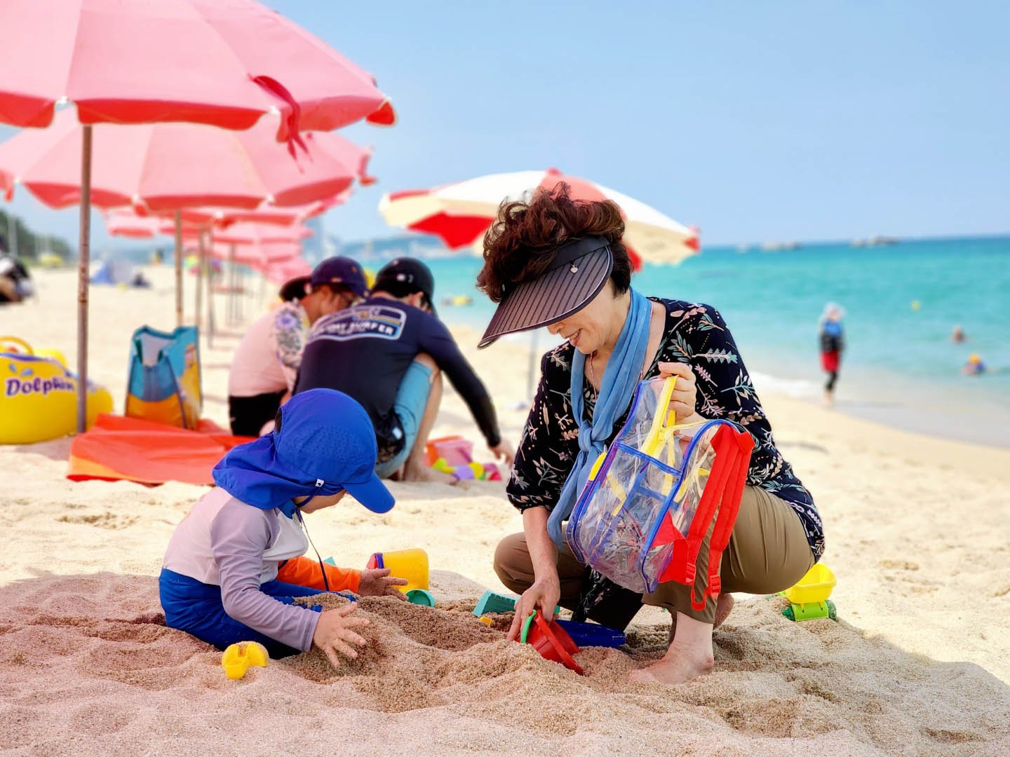 푸르른언덕에서, 하얀파도가 부서지는 바닷가에서 할아버지 할머니는 사랑스러운 손주와 함께