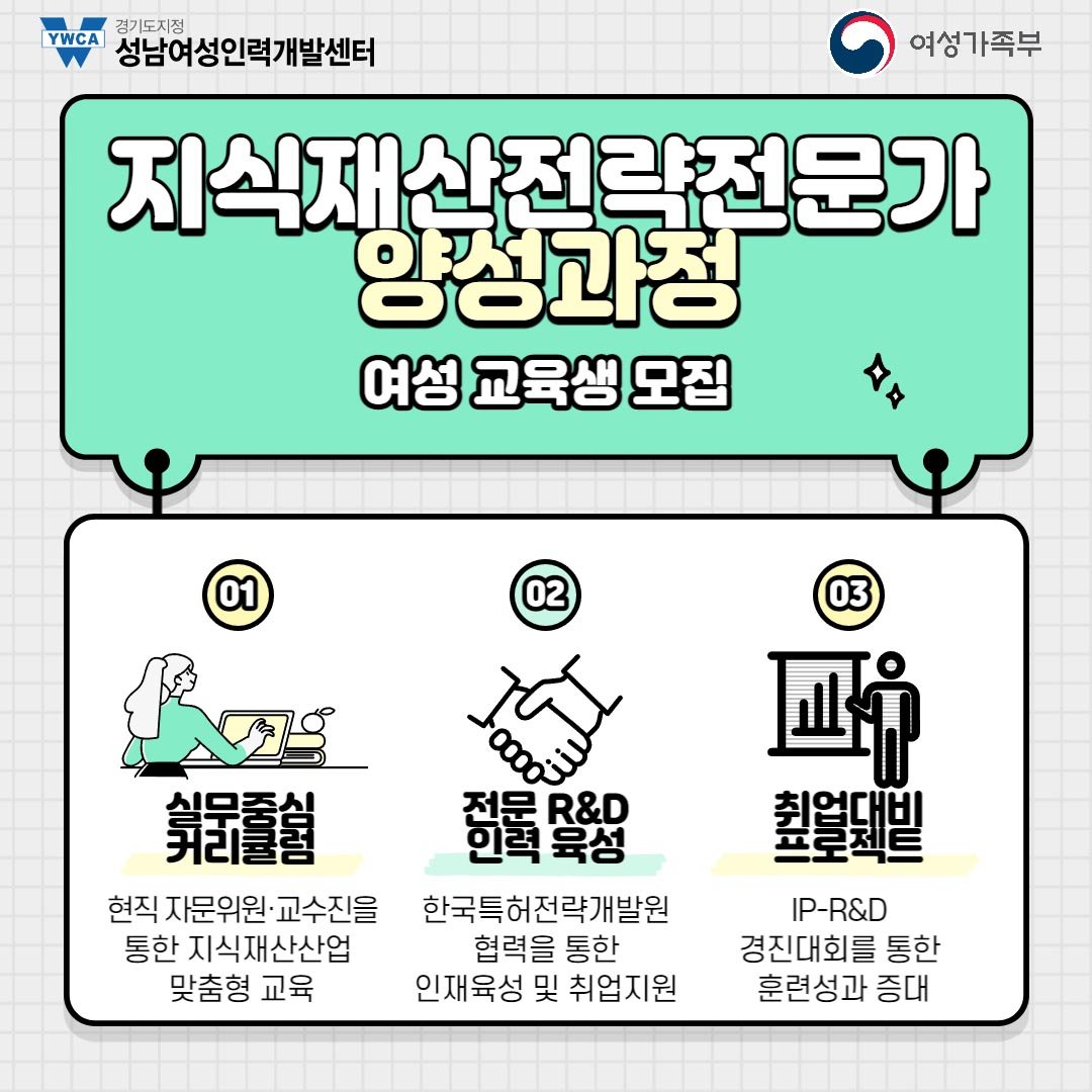 지식재산전략전문가 양성과정은 성남여성인력개발센터가 한국특허전략개발원과의 업무 협약을 통해 교육기획 및 실무중심의 커리큘럼 개발을 통해 추진하는 교육훈련으로, 4월 18일부터 6월 27일까지 총 47일간(1일 4시간, 총 188시간) 전문 IP-R&D 인재를 육성하고 취업을 지원하는 사업이다.