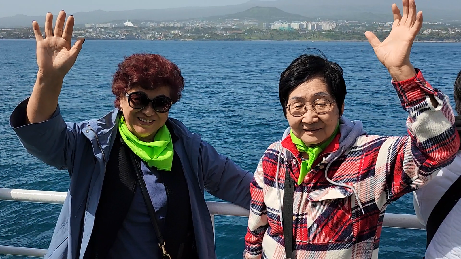 ▲유람선을 타고 제주도 수학여행을 즐기고 있는 민들레실버대학 학우들