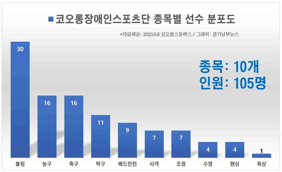 [코오롱장애인스포츠단 종목별 선수 분포도] *자료제공: 2023.6.8 코오롱스포렉스 / 그래픽: 경기남부뉴스