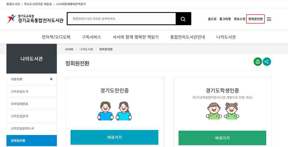 경기교육통합전자도서관 누리집에서 회원가입후 우측상단에 있는 '정회원전환'을 눌러야 경기도민임이 인증된다.