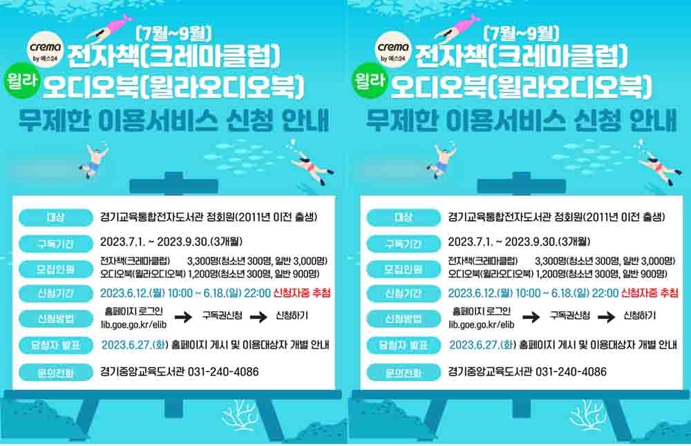 신청 대상은 경기교육통합전자도서관 중학생 이상 정회원으로 추첨을 통해 ▲전자책 구독권 총 3,300명(청소년 300명, 일반 3,000명) ▲오디오북 구독권 총 1,200명(청소년 300명, 일반 900명)에게 제공한다.