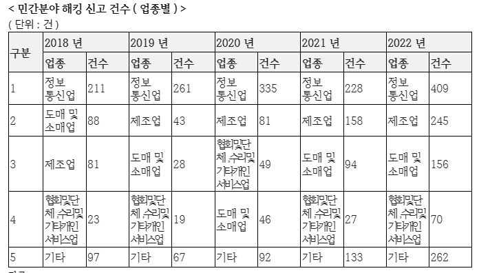 홍석준 의원이 한국인터넷진흥원에서 제출받은 민간분야 해킹 신고 건수 현황에 따르면 , 2018 년 500 건에서 2022 년 1,142 건으로 해킹 피해가 급격히 증가하고 있는 것으로 나타났다 . 피해 업종별로 보면 , 2022 년 기준 정보통신업이 409 건으로 가장 많았고 , 제조업이 245 건 , 도매 및 소매업이 156 건으로 그 다음이었다 .
