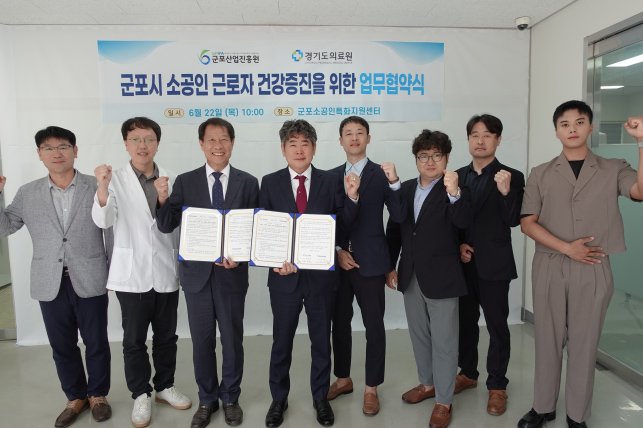 지난 6월 22일(목) 당정동에 위치한 소공인특화지원센터에서 군포산업진흥원과 경기도의료원은 군포시 소공인 기업과 근로자들의 안전 예방과 건강증진 지원 사업을 위한 업무 협약을 맺었다.