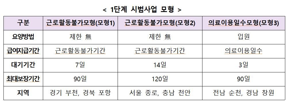 (모형1) 질병·부상으로 일하지 못하는 기간에 지급, 대기기간 7일, 보장기간 최대 90일/ (모형2) 질병·부상으로 일하지 못하는 기간에 지급, 대기기간 14일, 보장기간 최대 120일/ (모형3) 입원 발생시 입원·관련 외래일수 만큼 지급, 대기기간 3일, 보장기간 최대 90일 *자료: 보건복지부