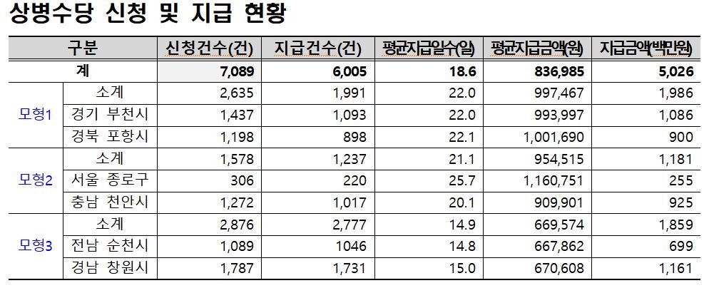 상병수당 1단계 시범사업은 지난해 7월 4일부터 서울 종로구, 경기 부천시, 충남 천안시, 전남 순천시, 경북 포항시, 경남 창원시 등 6개 지역에서 시행했고, 1년간 총 6,005건, 평균 18.6일에 대하여 평균 83만 7,000원(23.6.23 기준)이 지급됐다.