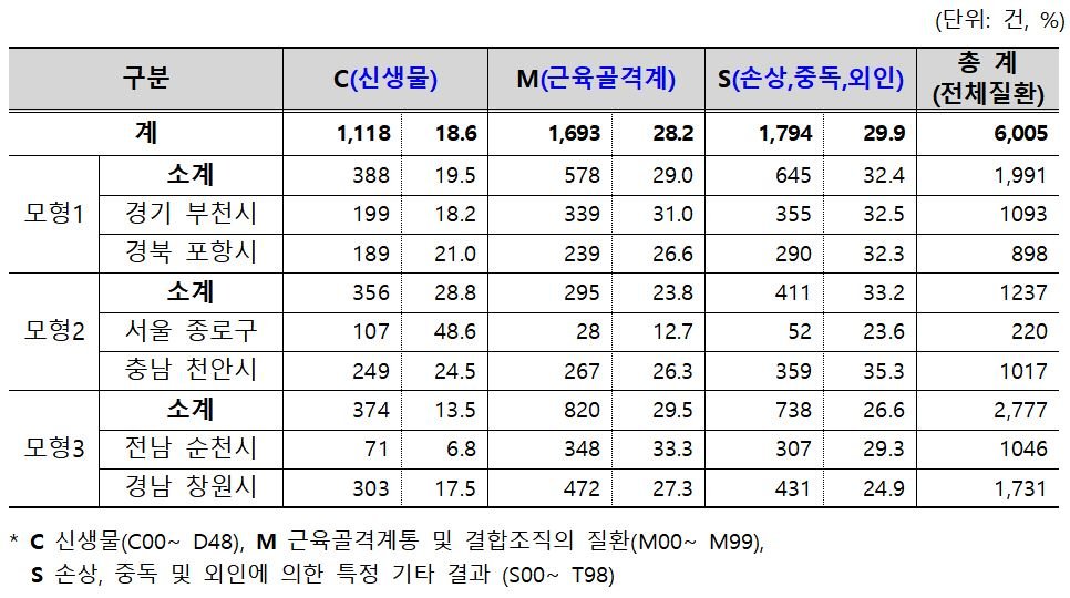 상병수당 수급자의 주요 질환은 ‘목·어깨 등 손상 관련 질환(S*상병)’이 1,794건(29.9%), ‘근골격계 관련 질환(M*상병)’이 1,693건(28.2%), ‘암관련 질환(C*상병)’이 1,118건(18.6%) 순이었다. 대기기간이 14일로 가장 긴 모형2는 비교적 중증질환인 ‘암관련 질환(C*상병) 비중이 28.8%로 다른 모형에 비해 높았다.