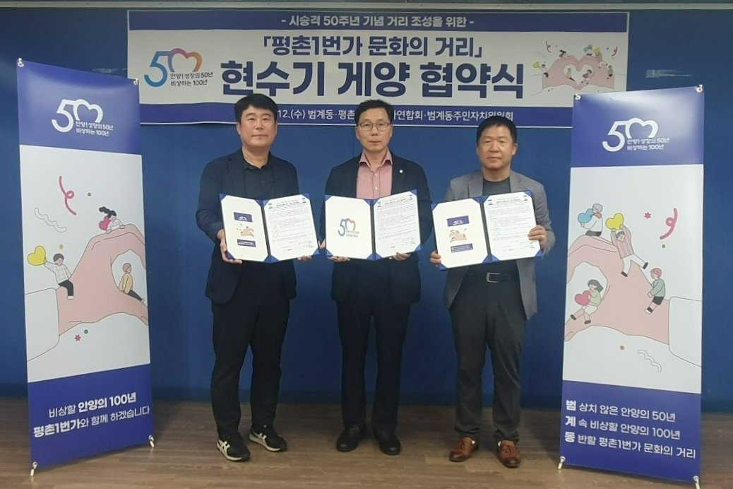 안양시 범계동 행정복지센터는 지난 12일 동 주민자치위원회 및 평촌1번가연합회와 시 승격 50주년 기념 거리 조성을 위한 ‘평촌1번가 문화의 거리 현수기 게양’ 협약식을 개최했다고