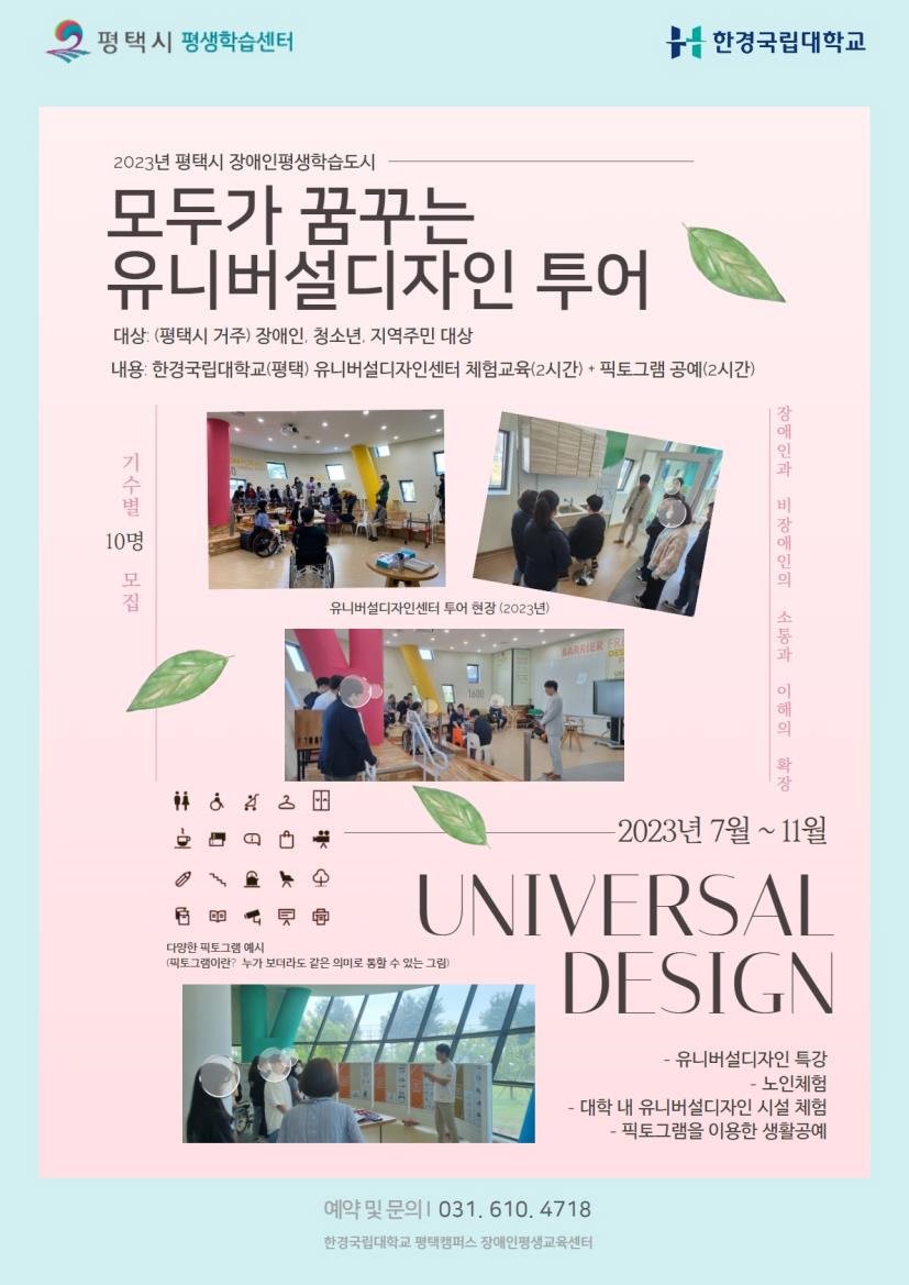 본 투어는 2023년 ‘평택시 장애인 평생학습도시’ 신규 사업의 일환으로, 한경국립대 유니버설디자인센터 투어와 메이킹 활동을 연계하여 진행하는 장애이해교육 및 체험 프로그램이다.