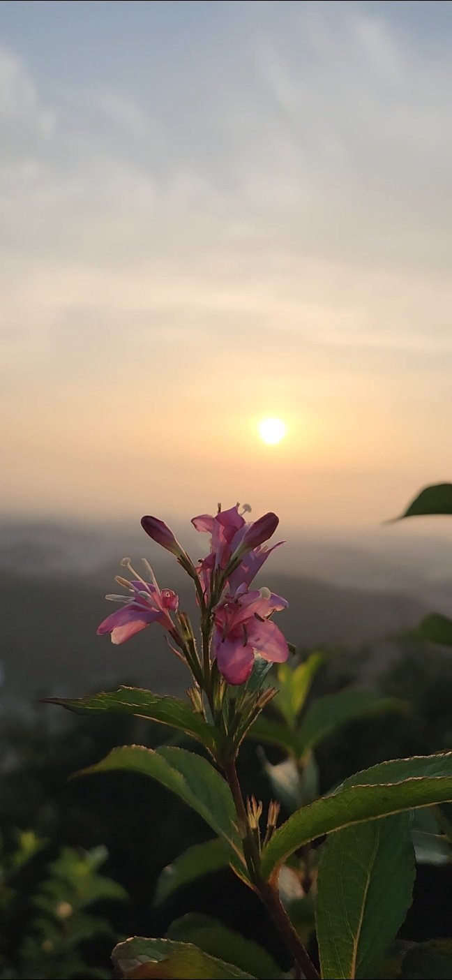 화성시에 있는 태행산은 높이 294.8m로 일몰과 야경이 아름다운 산이다.  비가 갠후 오늘 오후 7시  아름다운 꽃 뒤로 저멀리  일몰이 지고 있는서해바다가  희미하게 보이고 있다.