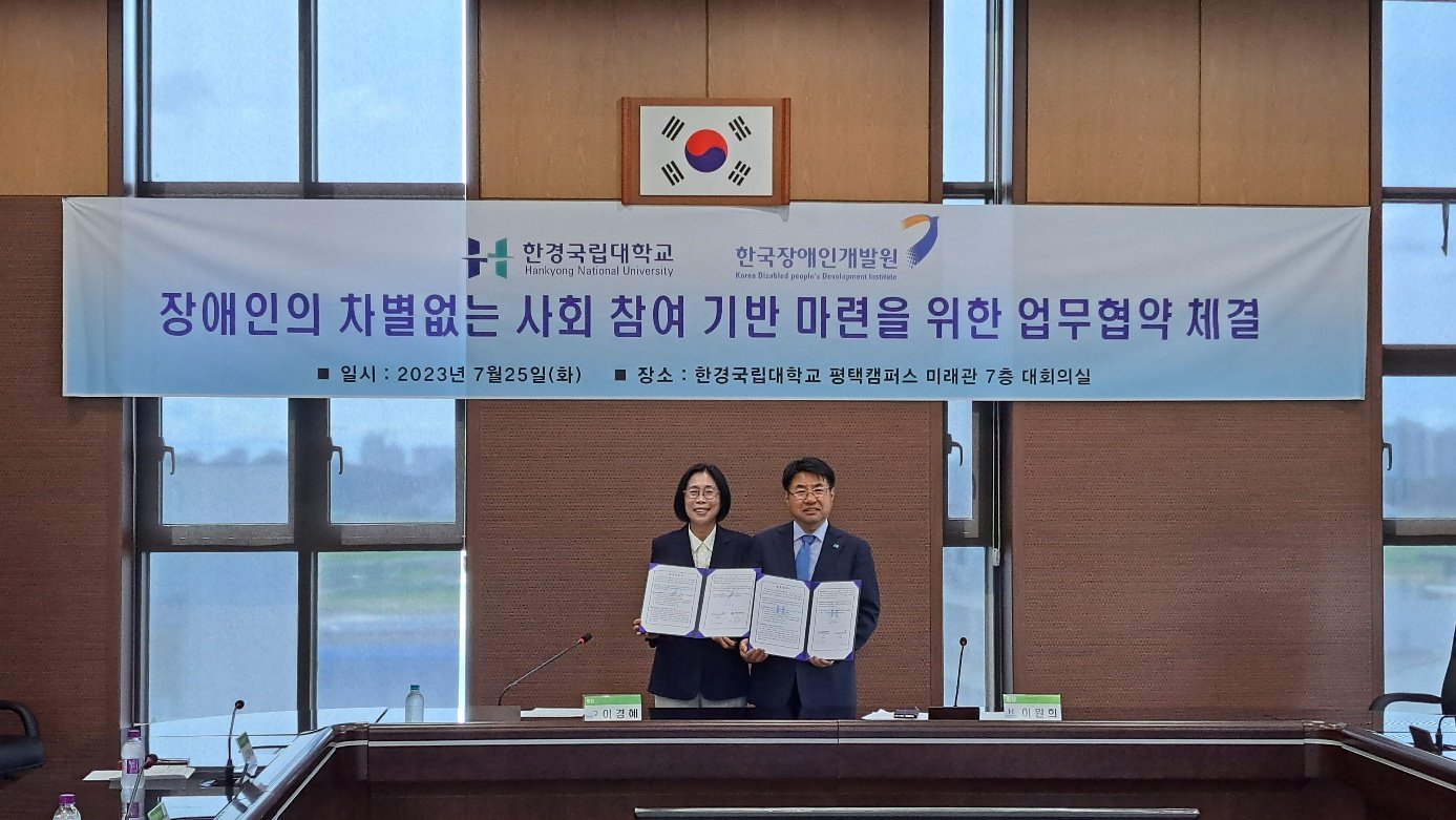 7월 25일 한경국립대학교(총장 이원희)는 한국장애인개발원(원장 이경혜)과 유니버설디자인 분야 저변확대와 인재양성을 위한 업무 협약을 체결하였다.