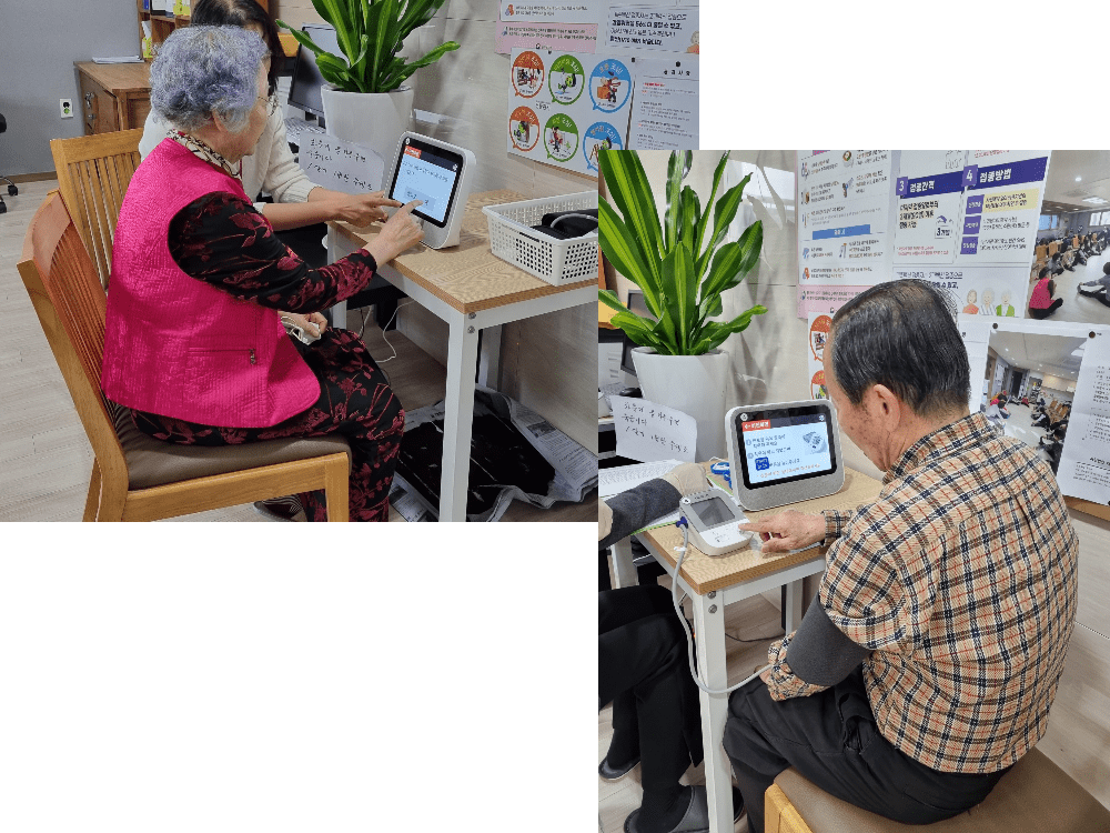 이 스마트기기(AI스피커 및 건강측정기기)는 노인 만성 질환관리를 위한 것으로 경로당을 이용하는 어르신들은 경로당에 설치된 기기로 건강을 수시로 측정할 수 있다.