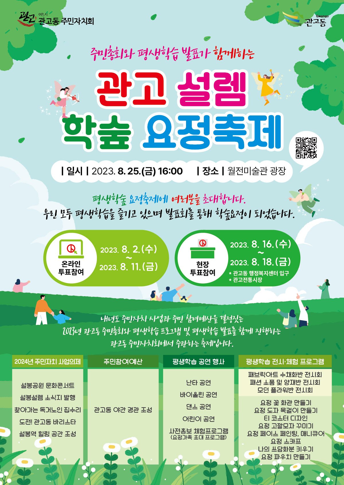 관고동 주민자치회에서 주관하는 관고동 주민총회와 평생학습 발표회를 연계하여 진행하며, 사업추진 찬반 및 우선순위 결정을 위한 투표가 진행되며, 사전에 8월 2일부터 8월 11일까지는 온라인 투표를, 8월 16일부터 8월 18일까지는 관고동 전통시장과 관고동 행정복지센터에서 현장 투표를 실시 할 예정이다.