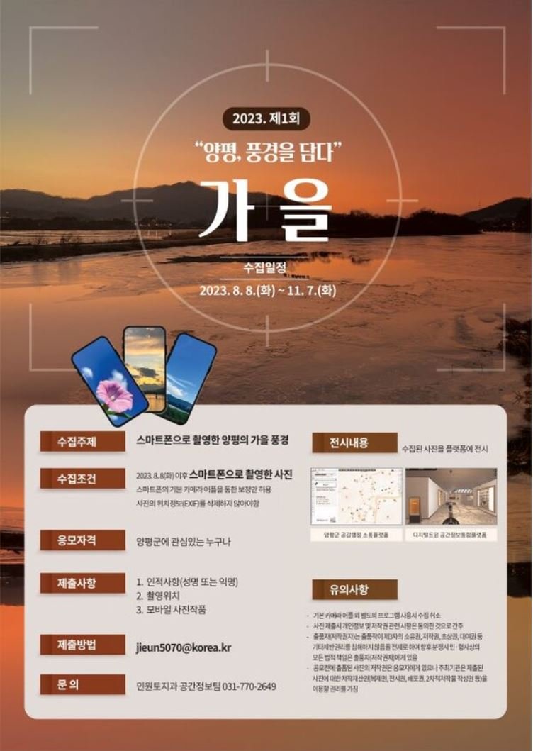 8월 8일 입추부터 11월 7일까지 양평군에서 아름다운 양평의 가을 풍경 사진을 주제로 새롭게 구축 중인 플랫폼에 전시하고자 사진 수집 공고에 나섰다.