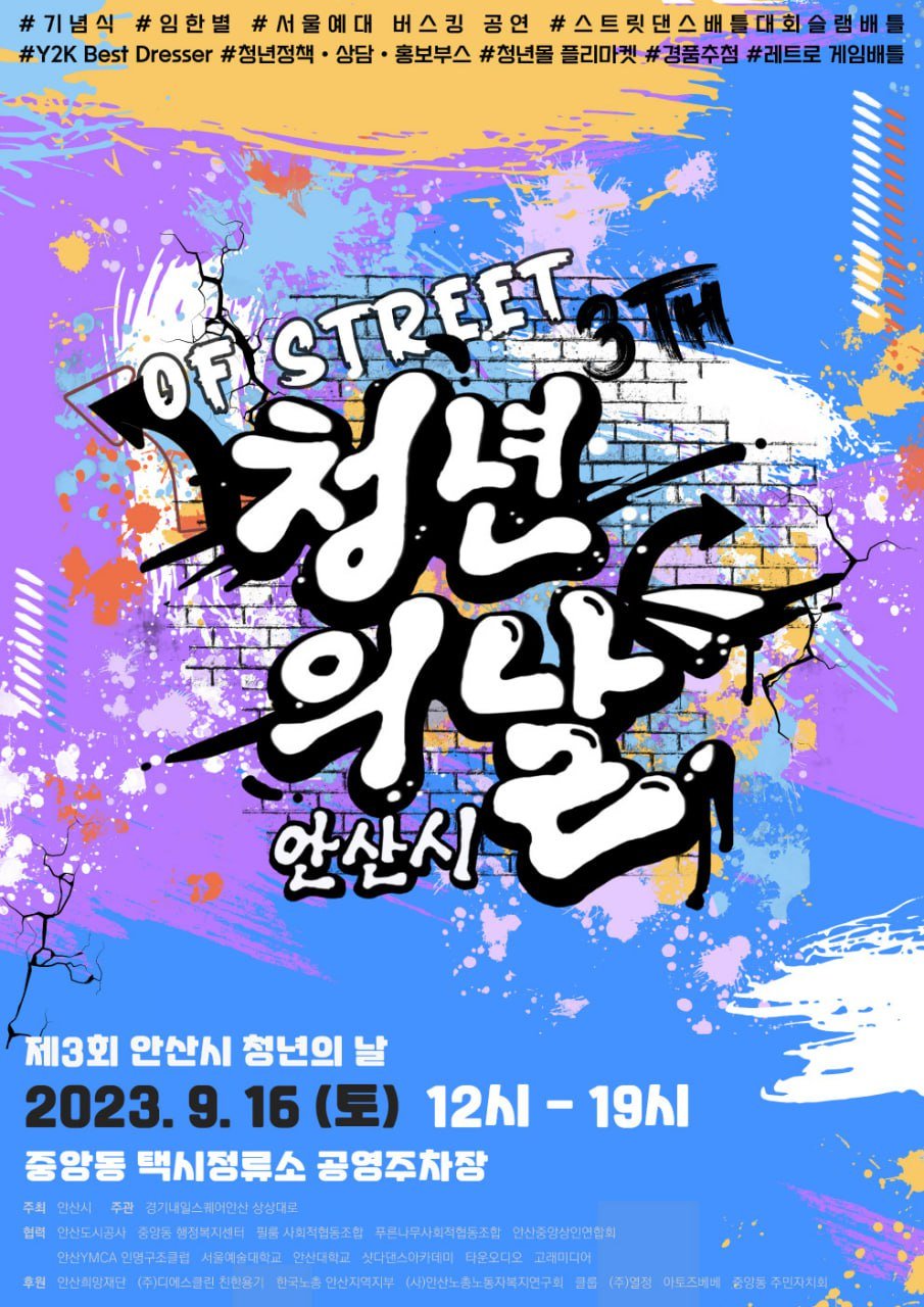 안산시에서 주최하고 경기내일스퀘어안산 상상대로에서 주관하는 ‘안산시 청년의 날’ 행사는 9월 16일(토) 오후 12시부터 7시까지 중앙동 공영주차장(고잔동 540번지)앞에서 진행된다.