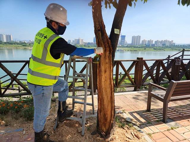 여주시(시장 이충우)는 남한강이 한눈에 보이는 강변로 일원 벚나무 가로수의 부패 방지와 원활한 생육을 위해 외과수술을 시행하였다고 밝혔다.