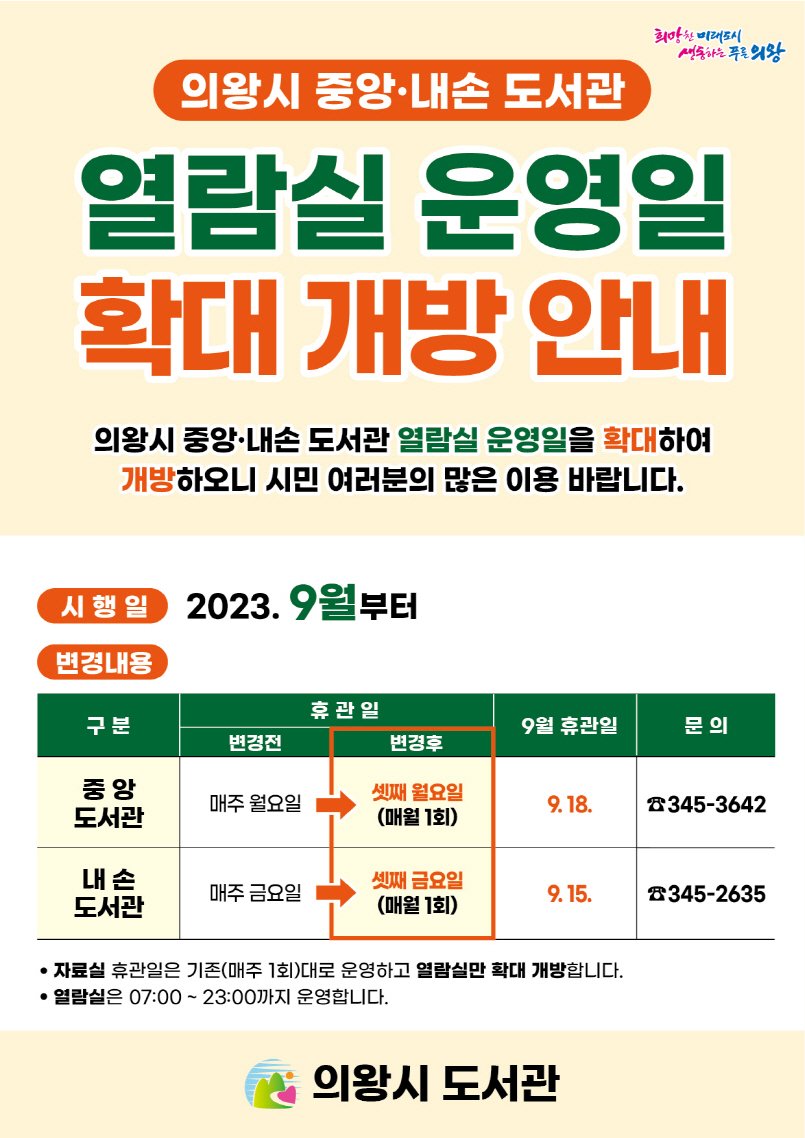 의왕시 중앙·내손도서관은 도서관 이용 활성화 및 이용자 편의 증진을 위해 오는 9월부터 열람실 개방일을 확대 운영한다고 밝혔다.