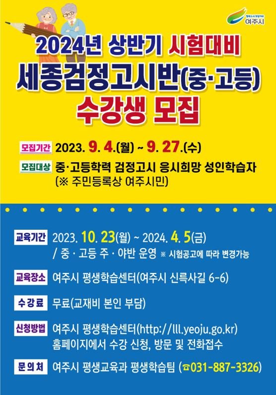 여주시(시장 이충우) 평생교육과에서는 여주시 성인학습자의 학력 취득을 통해 삶의 질을 향상하고, 평생학습도시 활성화를 위한 「2024년 상반기(4월) 시험대비 세종검정고시반」 학습자를 모집한다.